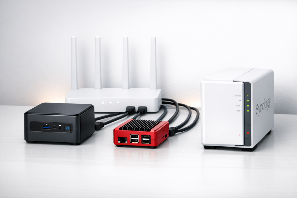 Beste Home Server Hardware 2026: Mini-PC vs Raspberry Pi vs NAS – Vergleich der besten Home Server Hardware 2026: Mini-PC, Raspberry Pi und NAS-System auf modernem Schreibtisch