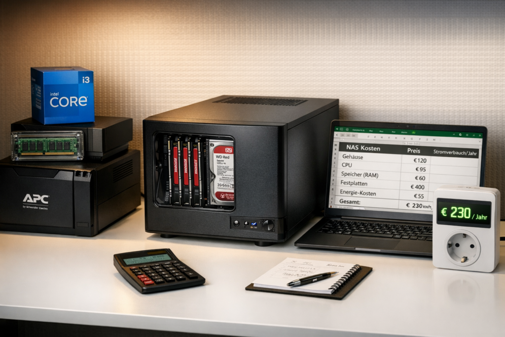 Du planst ein selbstgebautes NAS und rechnest mit 400-600 Euro Gesamtkosten? Diese Rechnung geht nicht auf. Die meisten Online-Kalkulatoren verschweigen dir kritische Kostenfaktoren: