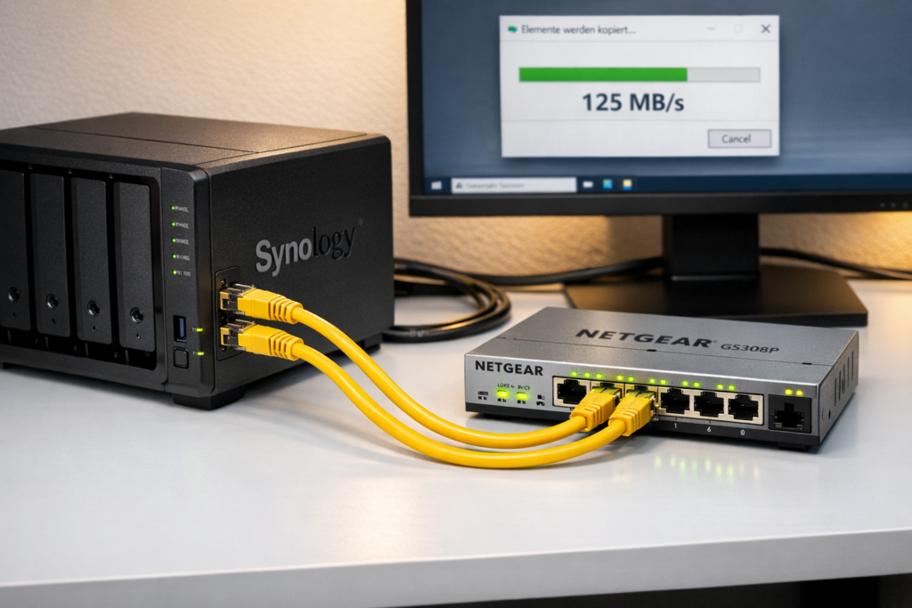 Wenn dein NAS nur 45 MB/s beim Kopieren großer Dateien erreicht und bei mehreren gleichzeitigen Zugriffen auf 15 MB/s einbricht, ist Link Aggregation mit einem Managed Switch die effektivste Lösung. Sie verdoppelt die verfügbare Bandbreite auf 2 Gigabit und verteilt die Last automatisch zwischen beiden Verbindungen.