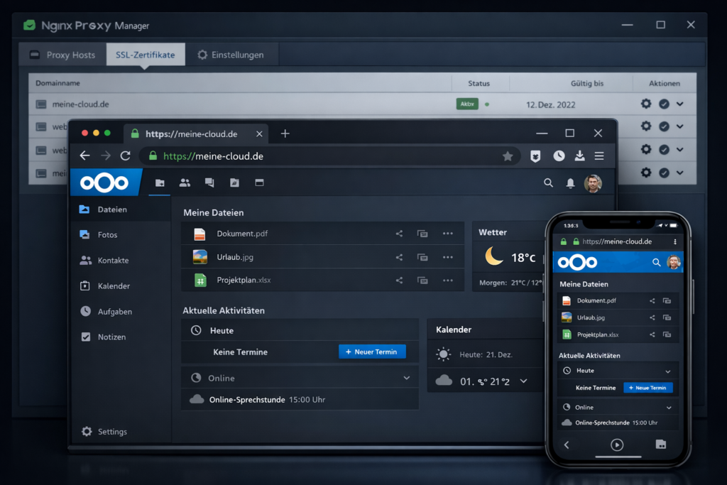 Ein Nginx Reverse Proxy macht deine Nextcloud professionell über HTTPS erreichbar und übernimmt das komplette SSL-Management automatisch. Der Nginx Proxy Manager ist die beste Lösung für Einsteiger – Web-Interface statt Konfigurationsdateien und automatische Let’s Encrypt Integration ohne manuelle Certificate-Verwaltung.