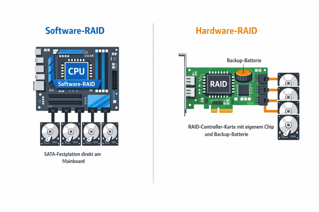 Software-RAID nutzt die Rechenpower deines Hauptprozessors und kostet praktisch nichts extra. Hardware-RAID braucht einen eigenen Controller mit eigenem Prozessor, Speicher und Batterie-Backup — das macht es teuer und kompliziert. Bewährte Regel: Für 90% aller Home Server Anwendungen ist Software-RAID die klügere Wahl, aber sichere deine Daten zusätzlich extern!